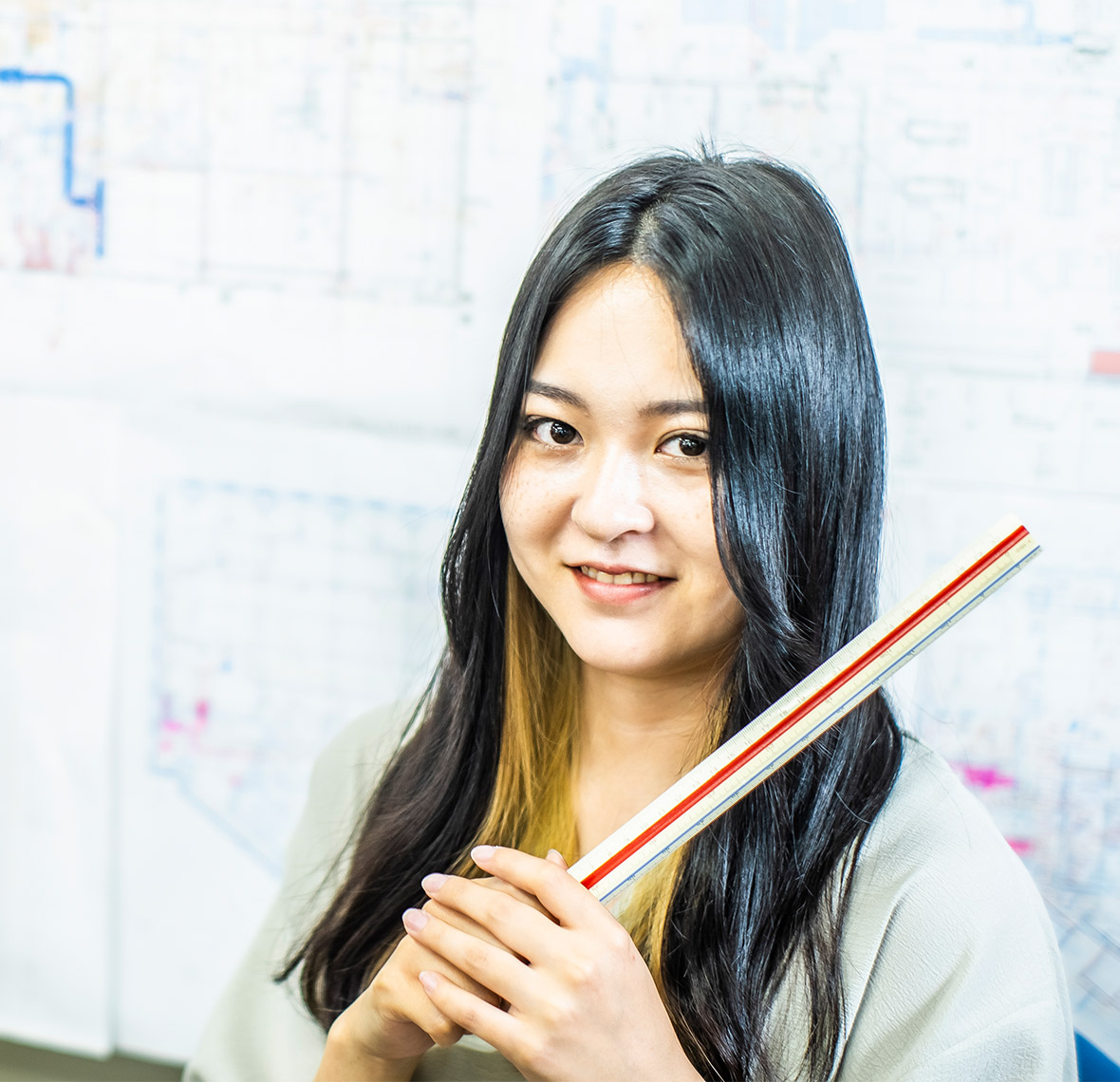 事務と社長のサポート役として働いています。主に積算を担当しています。図面を見ながら、どのサイズのダクトがどれくらいあるか、どの部材がどのくらいあるかなど拾い出し、各単価ごとに計算をします。